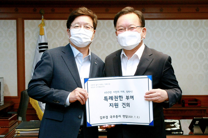 | ▲지난해 7월 염태영 수원시장이 김부겸 총리를 만나 특례권한 부여 지원을 요청하며 기념촬영을 하고 있다. |