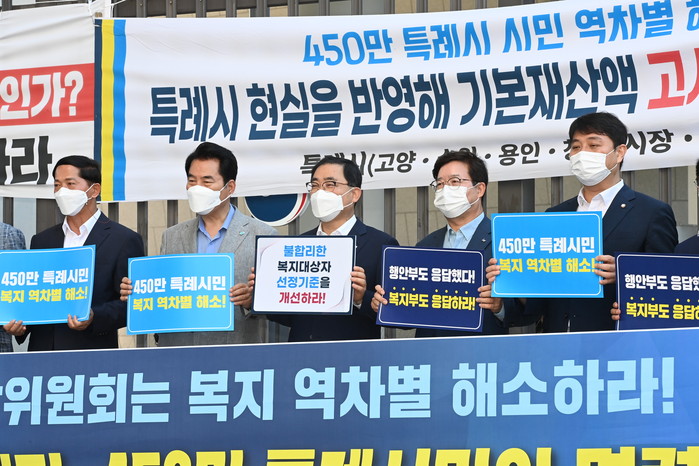 | ▲지난해 7월 염태영 수원시장을 비롯한 4개 특례시 대표들이 보건복지부 앞에서 집회를 열고 불합리한 복지대상자 선정기준의 개정을 요구하고 있다. |