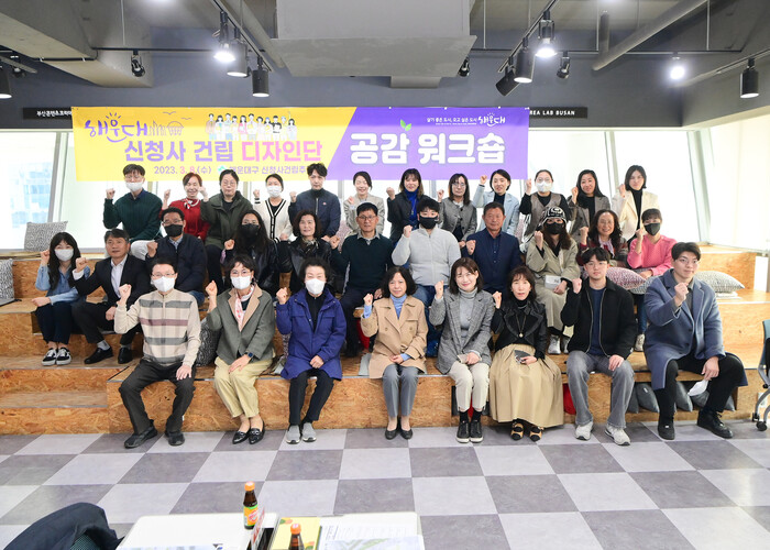 | ▲부산 해운대구는 지난 8일 부산문화콘텐츠콤플렉스에서 '신청사 건립 디자인단 공감 워크숍'을 개최한 뒤 기념촬영을 하고 있다. 해운대구 제공 |
