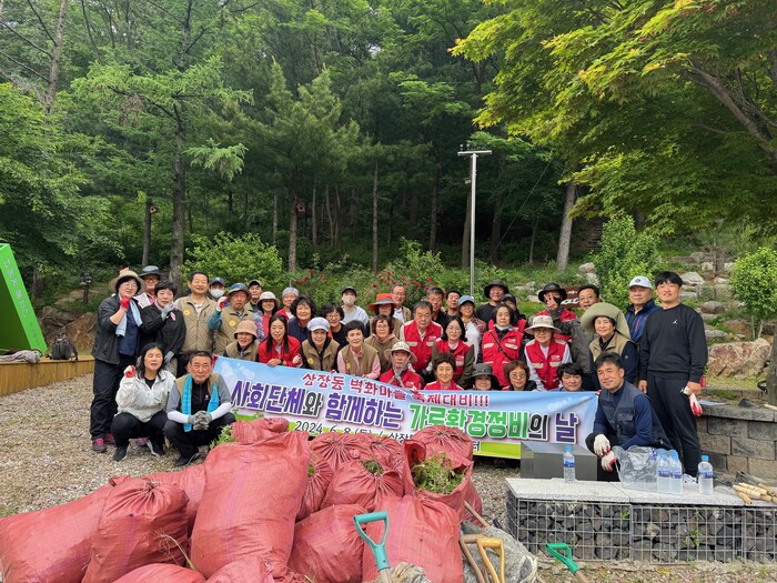 이날 환경정비는 '2024년 상장 벽화마을 축제'를 대비해 상장동 주민자치위원회, 통장협의회, 지역사회보장협의체, 새마을지도자협의회, 새마을부녀회, 바르게살기위원회 회원 등 60여 명이 참여해 풀베기, 화단정리, 쓰레기 수거 등 대대적인 정화 활동을 펼쳤다.