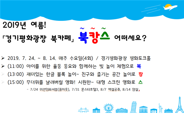 [로컬세계 이혁중 기자]경기도는 오는 24일부터 4주간 경기도청 북부청사 경기평화광장 북카페에서 ‘2019년 여름! 경기평화광장 북카페로 여름 북캉스 오세요~’라는 주제로 다양한 체험 프로그램을 추진한다고 17일 밝혔다.
