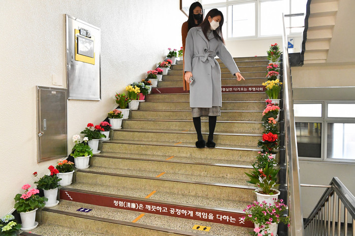 [로컬세계 맹화찬 기자]부산 해운대구가 코로나19 여파로 어려움을 겪고 있는 석대화훼단지를 돕기 위해 200여 개의 화분을 구입, 구청사 계단에 배치했다. 나팔수선화, 장미, 수국 등 화사한 꽃이 배치되자 주민들은 “코로나19로 우울한 분위기가 감도는 구청사 분위기가 한결 밝아진 느낌이다”고 입을 모았다.(사진=해운대구 제공)
