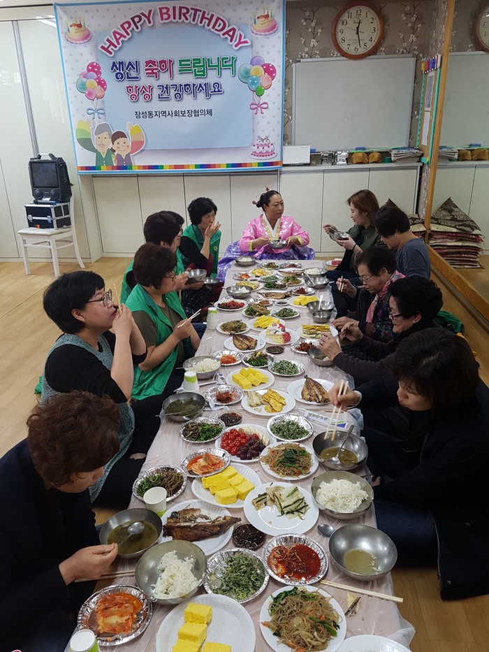 이날 장성동새마을부녀회 회원들은 세 분의 홀몸 어르신을 모시고, 정성스럽게 마련한 음식을 대접했으며 민요 공연과 어린이들의 생일 축하 공연이 펼쳐져 어르신들에게 즐거움을 선사했다.