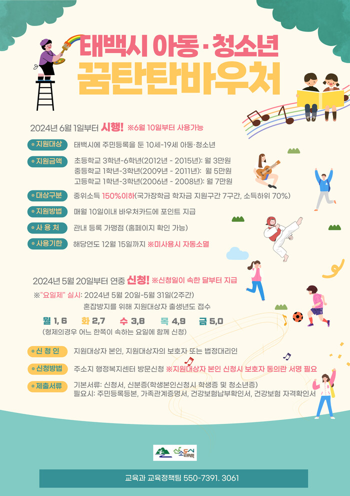 꿈탄탄바우처 지원사업은 태백시 학부모의 경제적 부담 완화 및 아동과 청소년들의 꿈을 지원하기 위해 추진하는 사업으로, 매월 일정 금액(나이에 따라 차등 지급)을 바우처카드 포인트로 지급하는 사업이다.