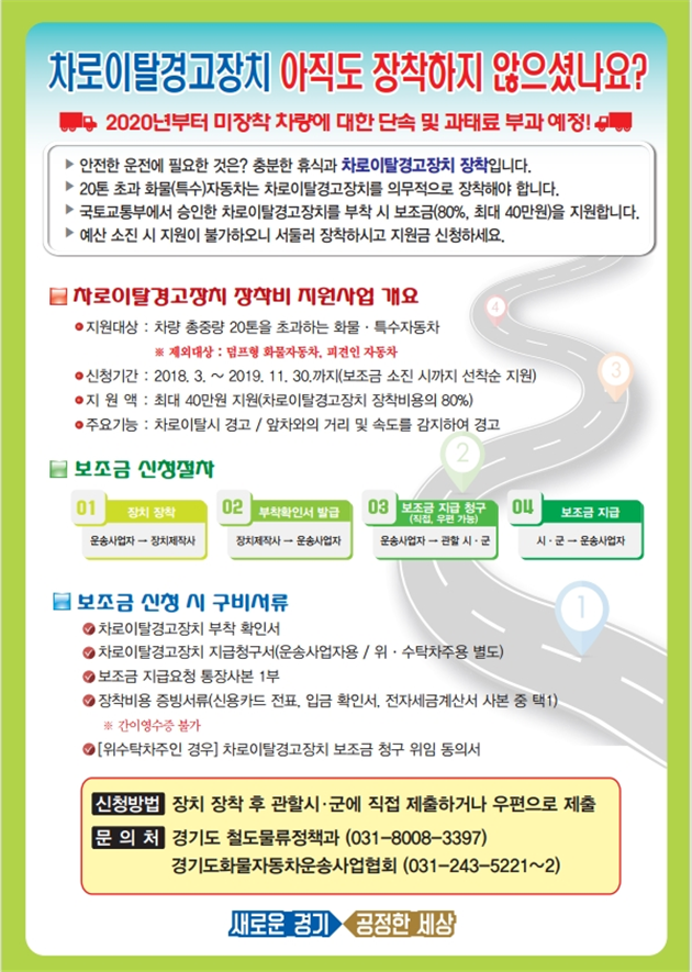 도 관계자는 “대형화물차 차주분들이 관심을 갖고 차로이탈경고장치를 장착하면 자칫 발생할 수 있는 사고를 예방하고 안전을 확보할 수 있다”며 “내년부터 단속이 이뤄지는 만큼, 올해 적극적인 참여와 신청을 당부 드린다”고 말했다.