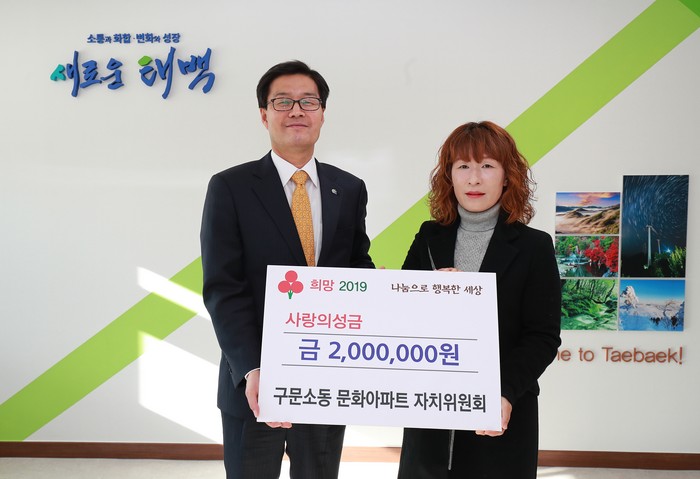 구문소동 문화아파트자치위원회(회장 우병선)가 지난 12일 태백시청을 방문해 ‘희망 2019 사랑의 성금’ 2백만 원을 기탁했다.