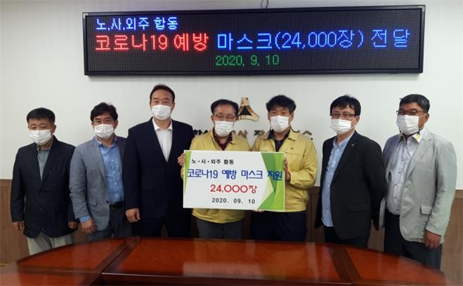 ▲장성광업소 노.사.외주 합동 코로나19 예방 마스크 기탁.(태백시 제공) |