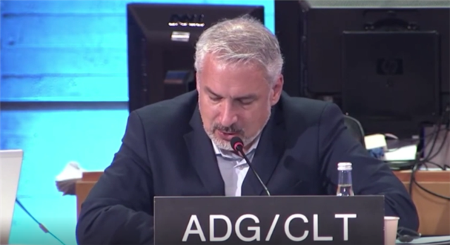 ▲지난 4일 진행된 ‘유네스코 문화다양성 당사국 총회 폐회식’에서 유네스코 문화부문 사무총장보 에르네스토 오토네(Ernesto Ottone R.)가 ‘한국 : 입체적 상상(Korea : Cubically Imagined)’ 전시를 소개하고 있다. 콘진원 제공 |