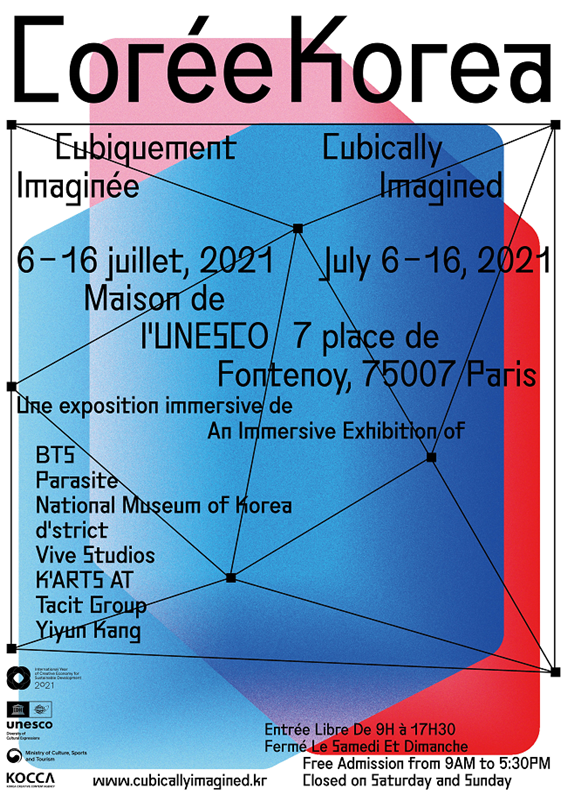 봉준호 감독의 영화 '기생충', 방탄소년단의 콘서트 등 한류 대표 콘텐츠를 활용한 융복합 실감콘텐츠 전시회 ‘한국 : 입체적 상상(Korea : Cubically Imagined)’이 프랑스 파리 유네스코 본부에서 오는 7월 6일부터 16일까지 개최된다.