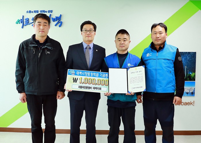 ▲자동차전문정비 태백지회는 지난 15일 시청을 방문해 향토 장학금 100만원을 기탁했다.(태백시 제공) |