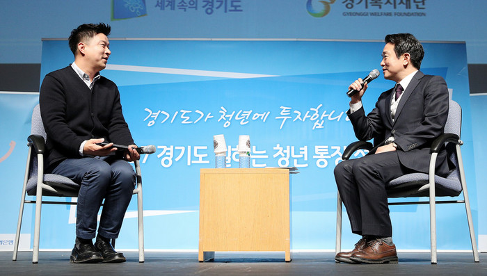 | ▲남경필 지사가 김생민씨와 함께 지난해 12월 3일 안산 문화예술의전당 해돋음극장에서 일하는 청년통장 토크콘서트 진행 모습. |