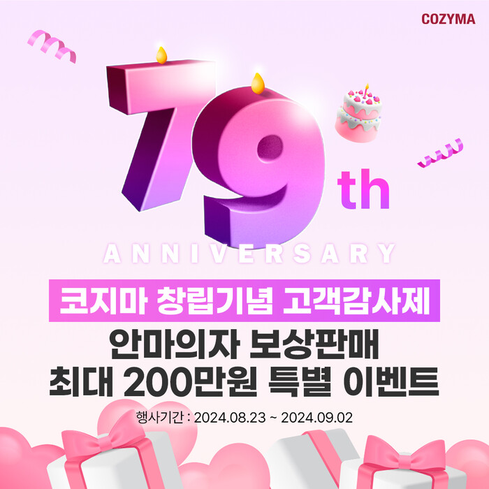 코지마 마케팅부 김경호 본부장은 “고객분들께서 오랜 시간 보내준 성원과 신뢰 덕분에 79주년을 맞이할 수 있었다”며 “감사의 마음을 담아 준비한 특별 프로모션을 통해 많은 분들이 혜택을 누리시길 바라며, 앞으로도 헬스케어 업계 선도 기업으로서 탁월한 제품과 차별화된 소비자 혜택을 꾸준히 선보여 나가겠다”고 말했다.