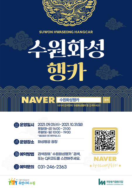 수원시 관계자는 “수원화성 자전거 택시 ‘행카’를 타고, 가을 수원화성의 정취를 느끼시길 바란다”며 “행카가 코로나19로 지친 시민들에게 작은 즐거움을 드릴 수 있을 것”이라고 말했다.