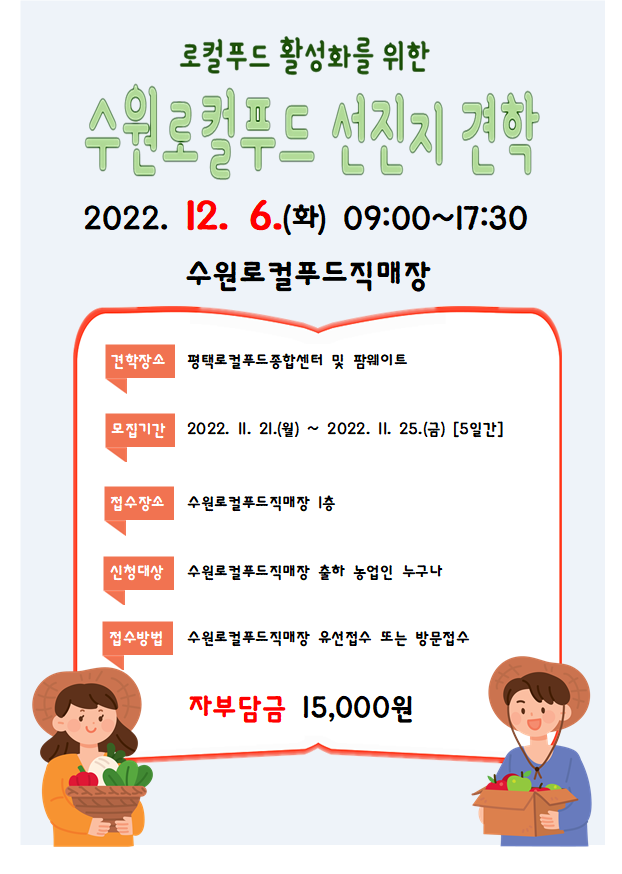참가자들은 12월 6일 오전 9시에 수원로컬푸드직매장으로 집결해 평택로컬푸드종합센터(평택시 오성면 청오로 33-34)와 팜에이트(평택시 진위면 하북2길 178)를 방문할 예정이다.