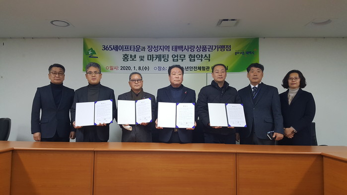 ▲태백사랑상품권 가맹점 홍보 및 마케팅 업무 협약 체결 후 기념촬영 모습.(태백시 제공) |