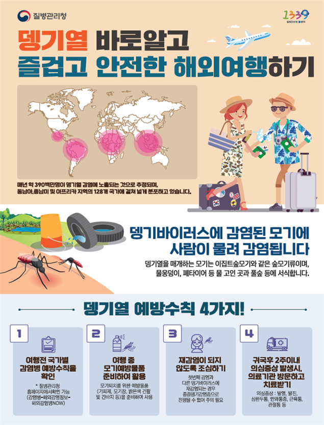 특히, 지난해 국내에서 발생한 뎅기열 환자는 206명으로 2022년(103명) 대비 2배 증가했고, 지난해 사업 목적으로 방글라데시를 방문한 한국인이 뎅기열에 걸려 입원치료 2일 만에 현지에서 사망하는 사례가 있었던 만큼, 감염에 더욱 주의해야 한다.