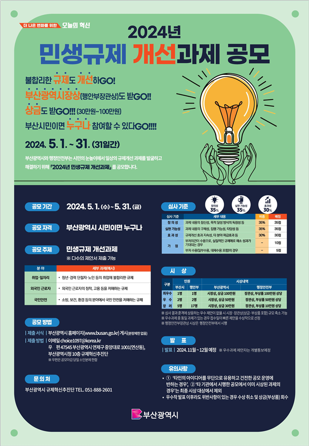 [로컬세계 부산=김의준 기자]부산시는 1일~5월 31일까지 5월 한 달간 행정안전부와 공동으로 시민의 눈높이에서 일상의 규제개선 과제를 발굴하고 해소하기 위한 「2024년 민생규제 개선과제 공모」를 개최한다고 밝혔다.