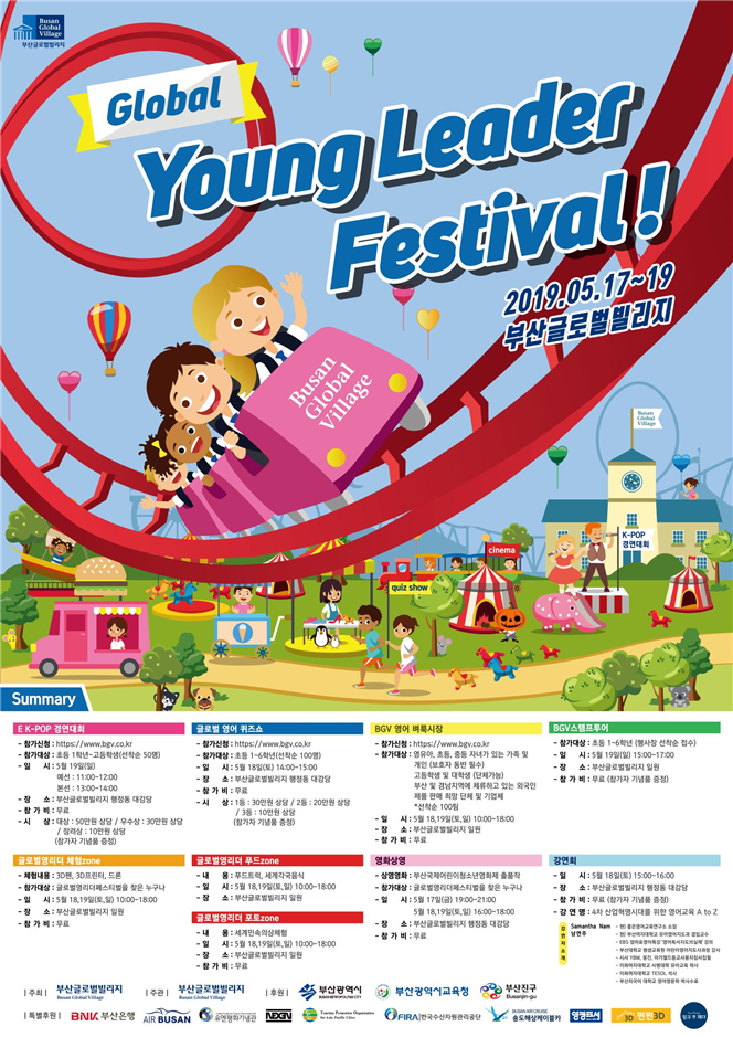 지난해에 이어 2번째 개최이며, ▲집에서 사용하는 물건을 가지고 나와 영어로 사고 파는 ‘영어 벼룩시장’ ▲영어로 내는 문제를 맞춰 최후의 1인을 가리는 ‘영리더 퀴즈쇼’ ▲한류의 중심인 케이팝을 영어로 바꿔 부르는 ‘e K-POP 경연대회’ ▲‘부산국제어린이청소년영화제 출품작 영화상영’ ▲세계 민속 의상을 직접 입어보고 기념사진도 찍을 수 있는 ‘글로벌 민속 의상 포토존’ 등으로 구성되며, 모든 행사는 누구나 무료로 참가할 수 있다.
