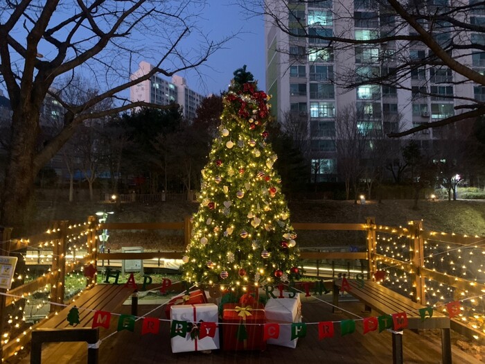 해피트리는 다음달 말까지 평일 오후 5시부터 10시까지 불을 밝힌다. 주민들의 소망은 물론 이웃의 안녕을 기원하는 희망 메시지를 달 수 있다.
