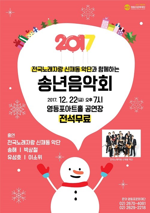 매월 문화가 있는 날을 채워오던 ‘영등포 구민과 함께하는 쇼쇼쇼’가 12월 27일을 끝으로 올해 공연을 마무리한다. 가수 강진, 유진아, 문연주 등이 출연해 더욱 알차고 풍성한 무대를 선보일 예정이다.