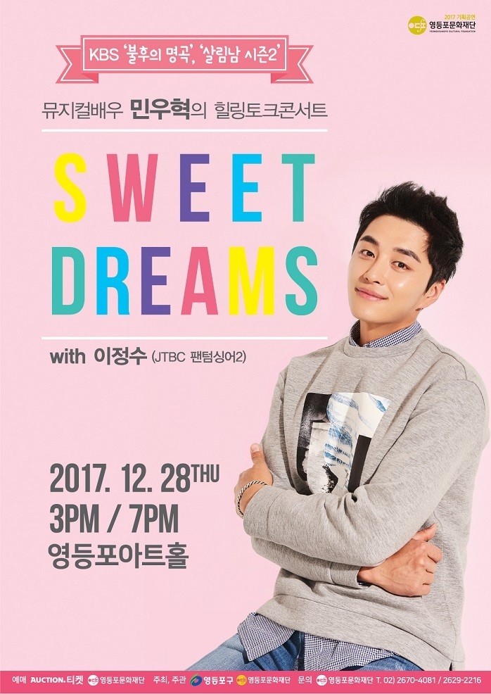 마지막으로 28일에는 뮤지컬 배우 민우혁의 힐링토크콘서트 ‘Sweet Dreams’이 개최된다. 민우혁은 뮤지컬 벤허, 안나 카레니나의 주역으로 ‘KBS 불후의 명곡’, ‘살림하는 남자 시즌2’ 등에 출연하며 인기를 얻었다. ‘JTBC 팬텀싱어2’에 나왔던 이정수도 함께 출연, ‘지킬 앤 하이드’, ‘노트르담 드 파리’, ‘미녀와 야수’ 등 유명 뮤지컬에 삽입됐던 명곡의 감동을 그대로 전하며 관람객들의 눈과 귀를 즐겁게 할 예정이다.