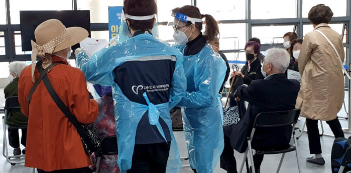 | ▲용인시자원봉사센터의 자원봉사자들이 처인구 코로나19 예방접종센터에 방문한 시민들을 안내하고 있는 모습. 용인시 제공 |