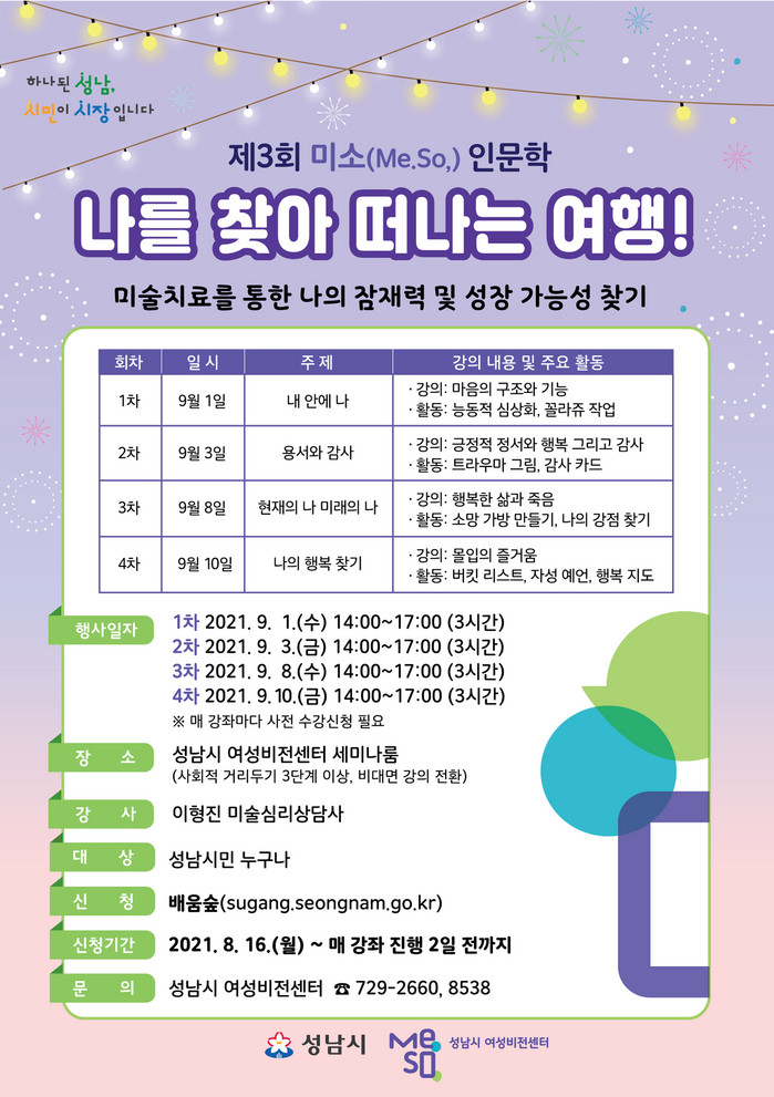 ‘나를 찾아 떠나는 여행!’을 대주제로 오는 9월 1일과 3일, 8일, 10일 오후 2시~5시 수정구 태평동 성남시 여성비전센터 세미나룸에서 강좌가 열린다.