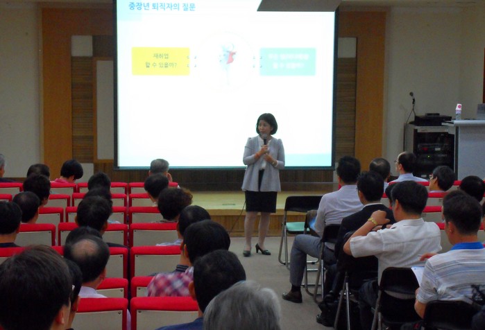 ▲김영희 한국무역협회 중장년 일자리 희망지원센터장이 중장년층을 대상으로 취업특강을 하고 있다. |