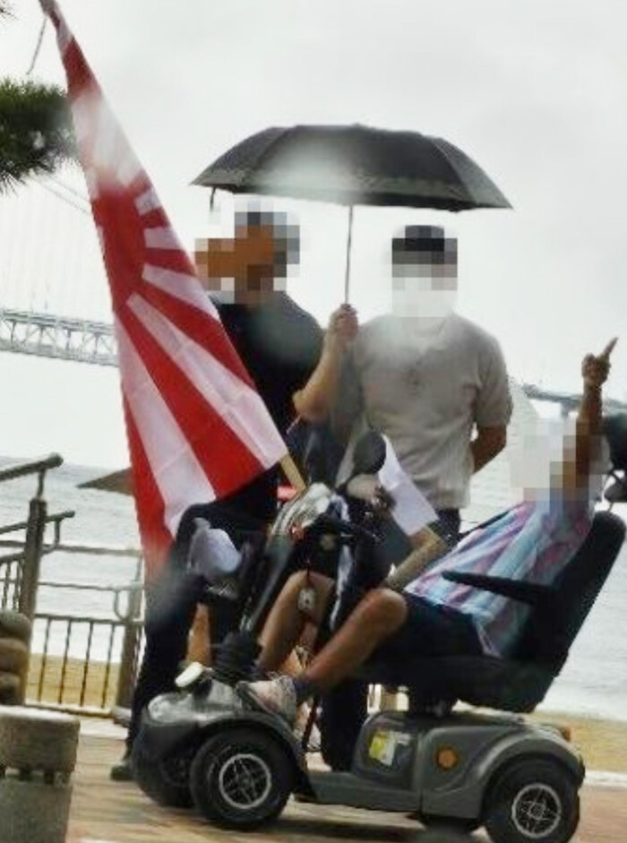 지난 28일 오전 10시쯤 벌어진 일인데, 자신의 전동휠체어에 욱일기를 매단 각목을 꽂은 상태로 돌아다니다 많은 민원이 관할 구청에 접수됐다.