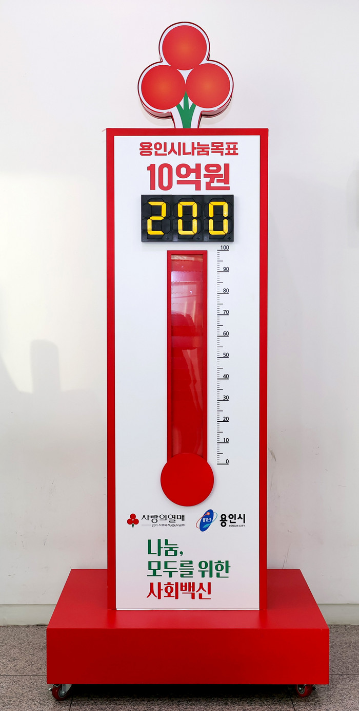 | ▲용인시의 연말연시 이웃돕기 운동인 ‘사랑의 열차 이어달리기’가 20억원을 돌파한 26일 용인시청 1층에 설치된 사랑의 온도탑 수은주가 200도까지 올랐다. 용인시 제공 |
