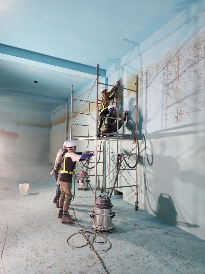 낡은 배수지 벽면과 기둥, 바닥에는 바탕면처리(바닥이나 벽면을 긁어 불순물을 제거하는 작업) 후 방수 작업을, 유입·유출밸브에는 녹을 방지하는 공사를 진행 중이다. 공사 완료 후에는 3일 동안 침수와 고압세척을 진행한다.