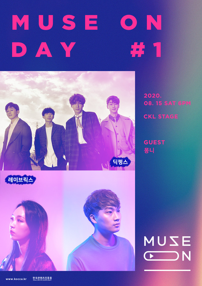 뮤즈온의 시작을 알리는 정기공연 ‘뮤즈온 데이(MUSE ON DAY)’는 오는 8월 15일부터 매주 토요일마다 광화문 CKL스테이지에서 총 10회 개최된다. ‘뮤즈온 데이’의 첫 공연에는 딕펑스와 레이브릭스가 출연해 파워풀한 밴드 사운드를 선보일 예정이며, 인디밴드로서 탄탄한 팬층을 확보한 몽니가 게스트로 함께한다.