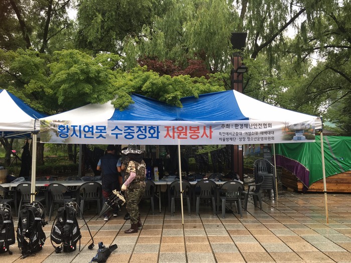 이날 행사는 환경재난협회 주관으로 오전 9시부터 오후 2시 까지 태백시, 특전예비군중대, 여성소대, 태백대대 자율방재단, 상장 청소년운영위원회 등 50명이 참여해 전문 스킨스쿠버 장비 및 고압세척기를 이용해 연못 내 수초와 조경석 부유물을 제거하고 연못 주변 환경정화를 실시했다.