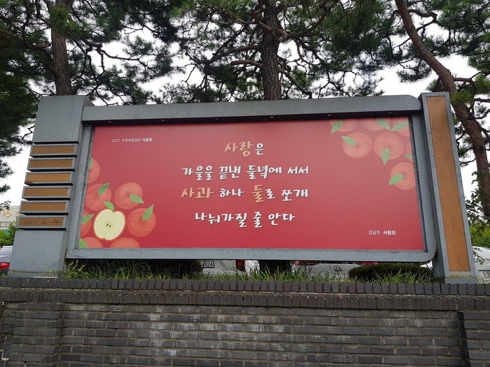 [로컬세계 김병민 기자]경기 수원시가 ‘2021년 수원희망글판 가을 편’ 문안 ‘사랑은 가을을 끝낸 들녘에 서서 사과 하나둘로 쪼개’를 9월 1일부터 11월까지 수원시 곳곳에 게시한다.