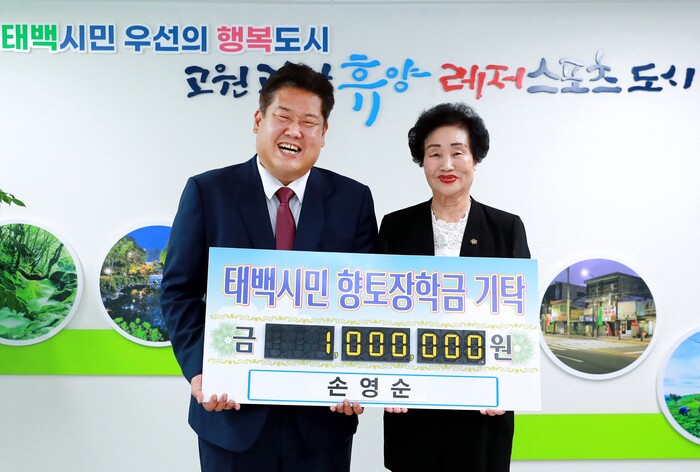 [로컬세계=박상진 기자] 전몰군경미망인 태백시지회장 손영순씨가 지난 27일 태백시청을 방문하여 장학금으로 100만원을 기탁했다.