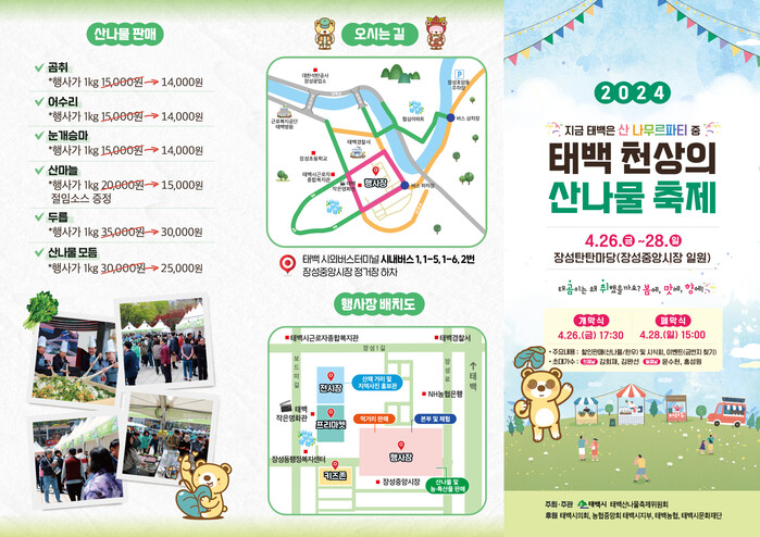 오는 26일부터 28일까지 3일 간 장성탄탄마당(장성중앙시장 일원)에서 시작되는 2024년 태백 천상의 산나물축제는 산나물 할인행사와 더불어 다양한 공연과 체험행사 준비되어 있다.