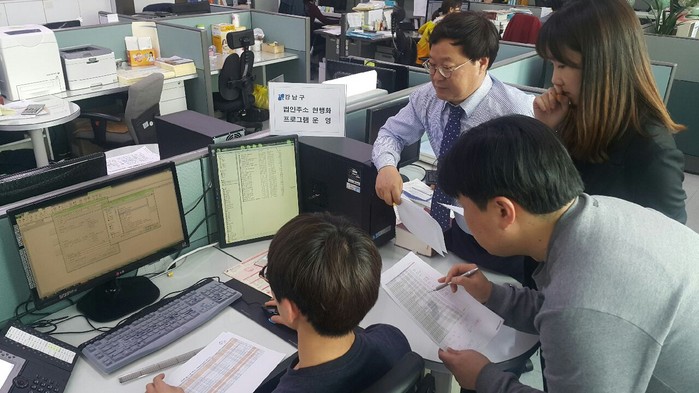 ▲강남구 세무2과 직원들이 체납법인 자료조사 프로그램을 통해 체납관리를 하고 있다. |