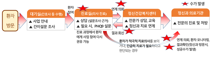 새로운 명칭과 함께 2년 연장 추진되는 이번 시범사업에서 달라진 점은 진료 전 대기실에서 환자를 대상으로 사업 안내, 참여 의향 확인 등 정신건강 문제 상담을 위한 사전 간이 조사과정이 추가됐다는 것이다.