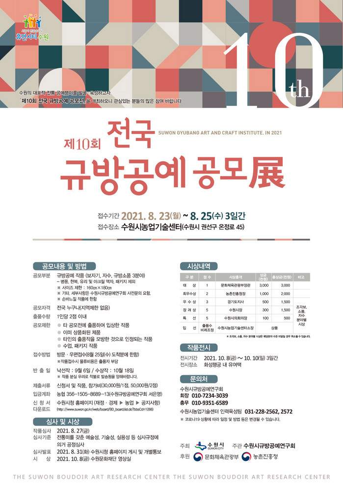 신청방법은 수원시 홈페이지 ‘재정·경제→농업→공지사항’에 게시된 ‘제10회 전국 규방공예 공모전 개최’ 공고문에서 내려받아 작성한 참가 신청서와 작품을 함께 방문 또는 우편으로 제출하면 된다.
