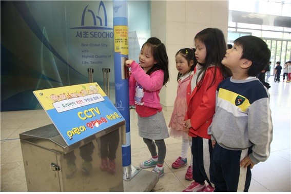 ▲‘CCTV 어린이 안전체험 프로그램’에 참여한 어린이들이 CCTV 비상벨을 누르고 있다. |