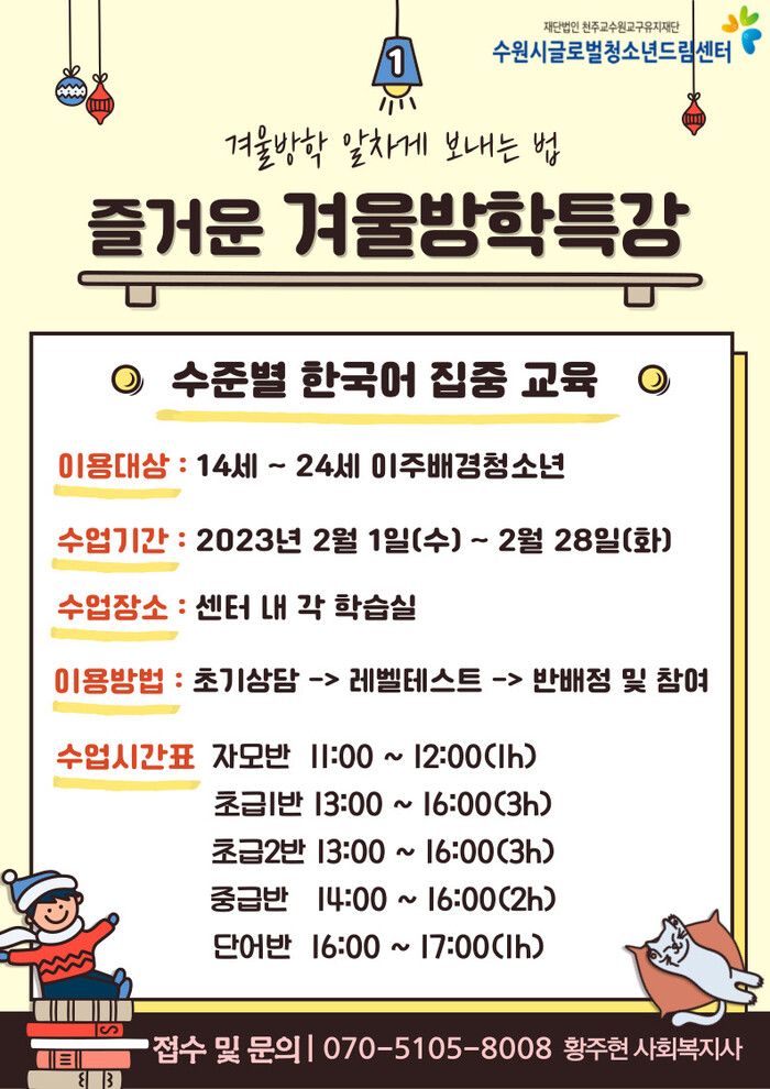 수원시 글로벌청소년드림센터 홈페이지의 ‘커뮤니티→프로그램안내’에 게시된 ‘2023년도 수준별 한국어 「훈린(隣,이웃)정음」 겨울방학 특강(한국어수업) 참여자 모집’에서 자세한 내용을 확인할 수 있다.