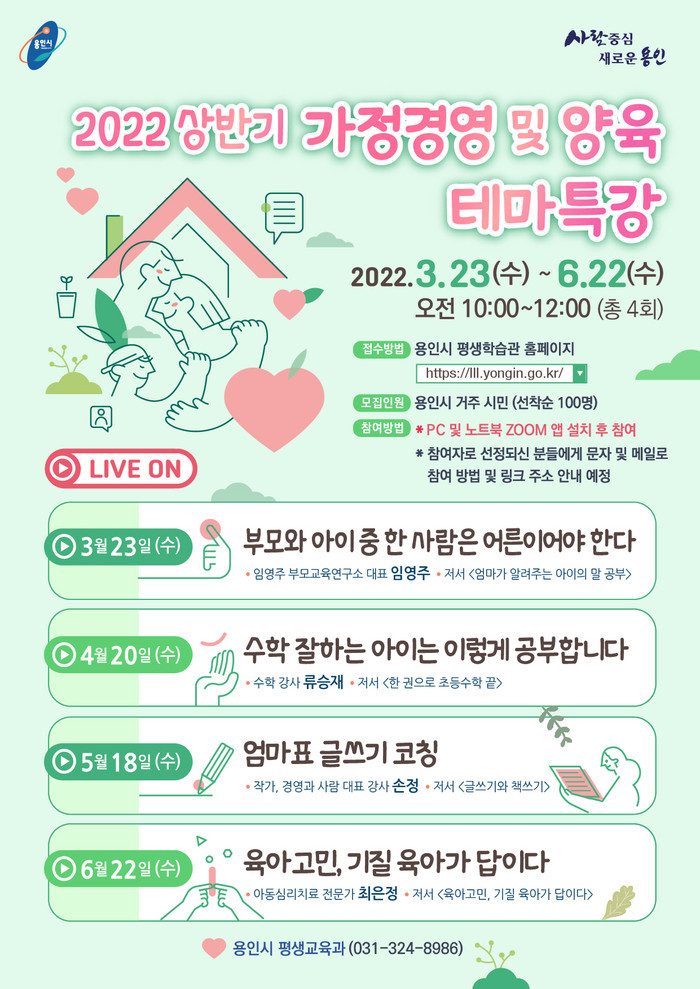 4일 용인시에 따르면 시는 오는 23일부터 6월 22일까지 화상회의 앱인 줌(ZOOM)을 활용해 ‘가정경영 및 양육’을 주제로 무료 테마 특강을 진행한다고 밝혔다.