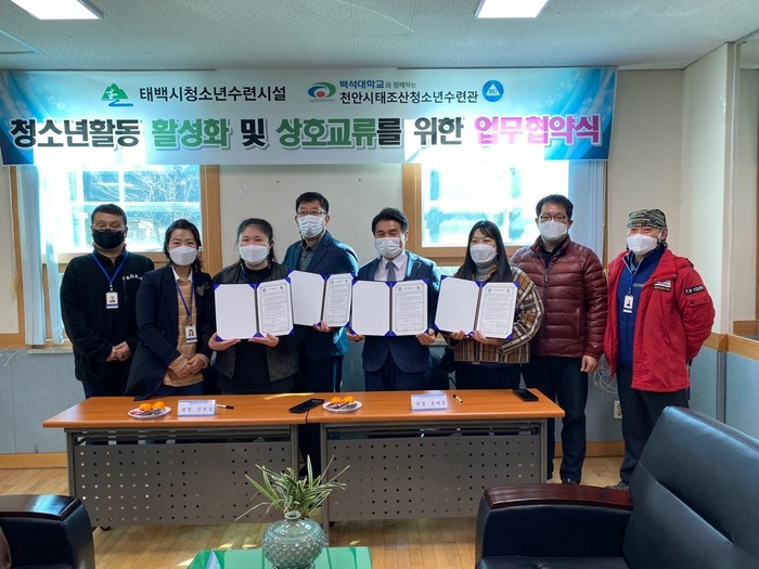 [로컬세계 박상진 기자]강원 태백시청소년수련시설(관장 김한섭)은 지난달 25일 천안시 태조산청소년수련관(관장 윤여숭)과 청소년의 참여 활동 활성화 및 상호협력을 위한 업무협약을 체결했다고 1일 밝혔다.