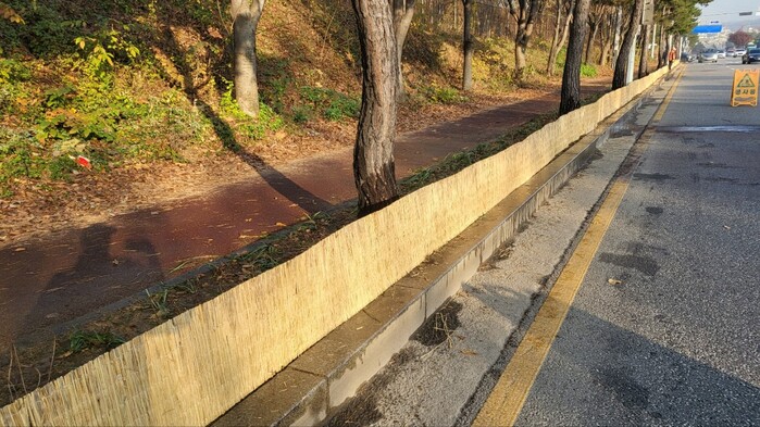 | ▲ 가로수 제설제 차단막을 설치한 띠녹지. 수원시 제공 |