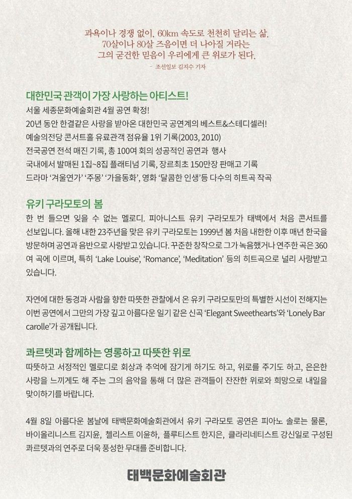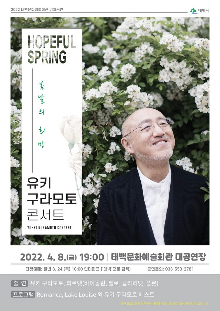 [로컬세계 박상진 기자]대한민국 관객이 가장 사랑하는 아티스트 ‘유키구라모토의 피아노 콘서트’가 오는 4월 8일 금요일 저녁 7시 태백문화예술회관 대공연장에서 개최된다.