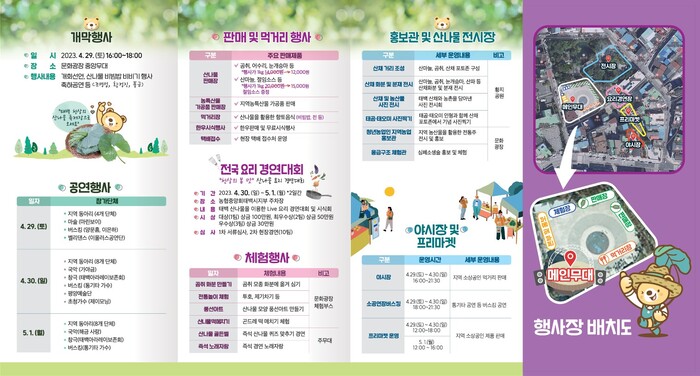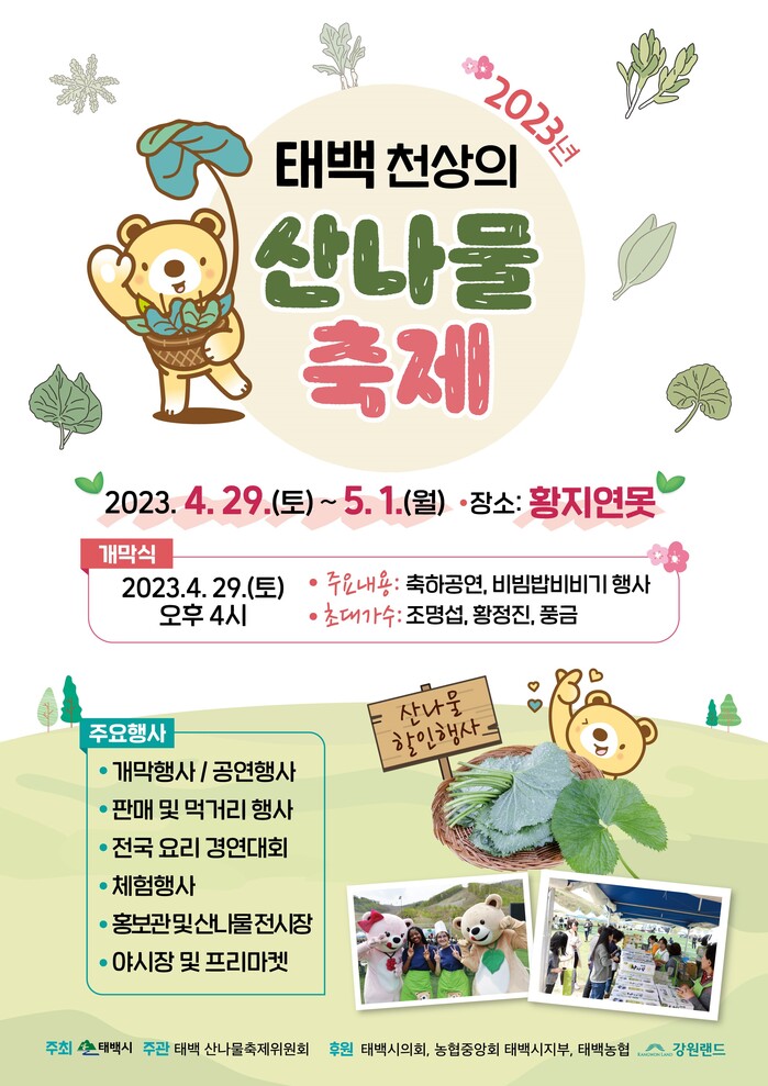 이상호 태백시장은 “이번 산나물 축제로 농업인의 소득향상과 건강한 먹거리를 시민들께 제공하는 계기가 될 것이며, 다양한 프로그램을 통해 다 같이 함께 즐기는 축제가 될 것으로 기대한다”고 전했다.