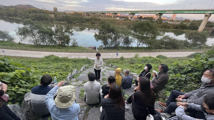 먼저 오후 4시부터 진행된 평화기원 여강길 걷기에는 20여 명이 참여해 양섬 인근의 산으로 올라가 민간인 희생자 유해 발굴터를 둘러보았다. 한국전쟁 전후 민간인 희생자 여주시유족회의 이인수 사무국장이 강사로 나서 직접 발굴터 몇 곳으로 안내하며 해설을 덧붙였다. 이인수 국장에 따르면, 한국전쟁 전후로 여주지역에서 희생된 민간인의 수가 확인된 사람만 287명, 추정되는 사람은 2,500여 명에 이른다.