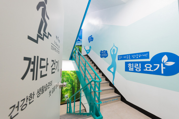 지하1층부터 7층까지 중앙계단은 넓게 펼쳐진 자연풍경 이미지 속에서 마치 산책하듯 자연미의 정취와 편안함을 느낄 수 있도록 디자인했다. 지하1층부터 8층까지 보조계단은 올바른 걷기 운동의 효과, 비만예방법, 건강명언, 알코올이 신체에 미치는 영향 등 ‘생활 속 건강 정보 제공’을 테마로 구성했다.