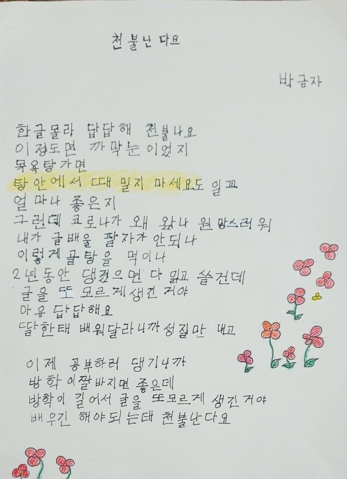 시 관계자는 “이번 시화전을 통해 비문해자의 성인문해교육 참여 동기를 유발하는 계기가 되길 바라며, 나아가 성인문해교육을 통해 배움에 대한 두려움을 극복하고, 만학의 꿈을 이루신 어르신들께 축하의 말씀을 드린다”라고 말했다.