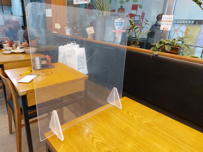 | ▲관내 한 음식점에 설치되어 있는 테이블 칸막이. 용인시 제공 |